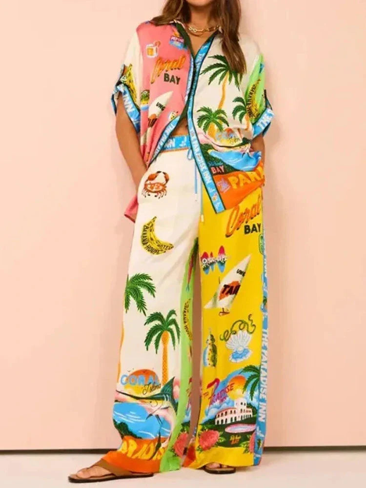 Indulge in comfortable elegance with this bohemian-chic set. Its vibrant and playful tropical print makes it more than just loungewear—it's a lifestyle statement for those who love color and carefree style.
