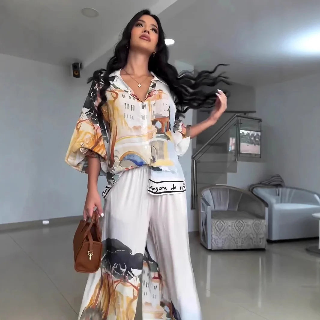 Step out of the ordinary and into a work of art. This stunning two-piece set transforms fashion into a canvas, featuring a picturesque print that tells a story of sun-drenched architecture and timeless style. It’s the perfect expression of sophisticated ease for any beautiful day.