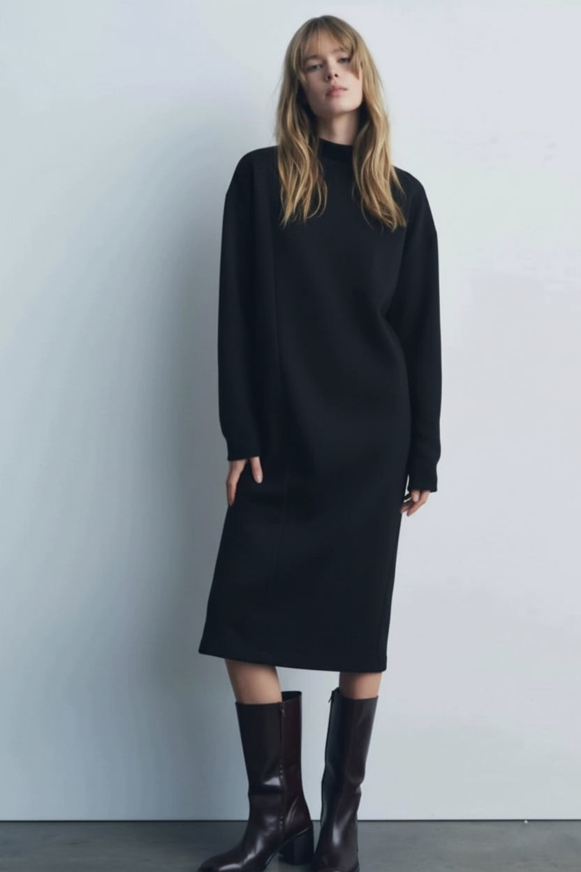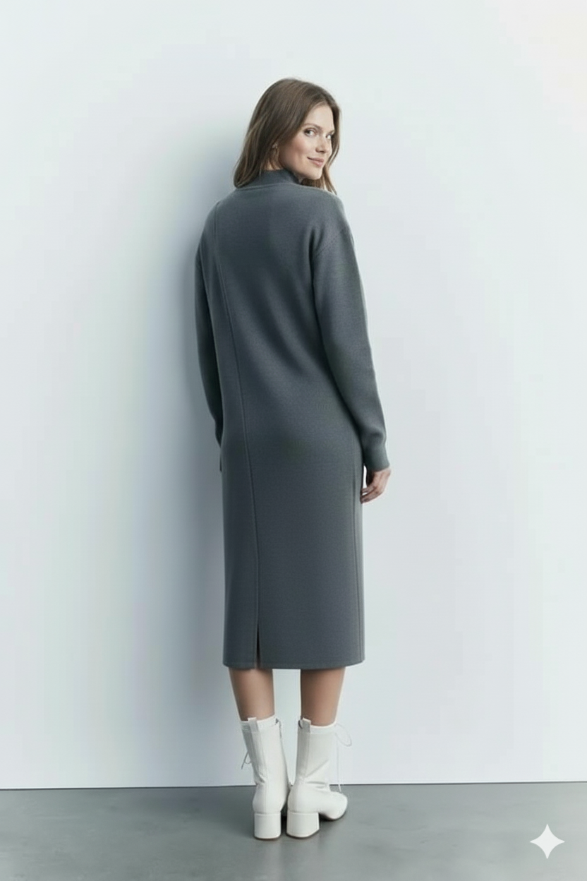 استقبلي الموسم الجديد بقطعة تجسد قمة الفخامة، الراحة، والبساطة الراقية. فستاننا المحبوك والمصمم بعناية هو القطعة الأساسية التي لا غنى عنها في خزانة ملابسكِ لموسمي الخريف والشتاء، حيث يمنحكِ مزيجاً مثالياً من الدفء الفائق والأسلوب العصري.