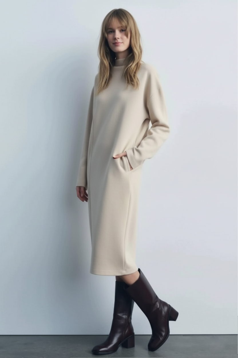 صُنع هذا الفستان من الكشمير الخالص 100% بنعومته التي لا تضاهى، ليغمركِ بإحساس من الدفء الرائع دون أي وزن إضافي. تمنحكِ الياقة العالية الأنيقة مظهراً راقياً وحماية إضافية من البرد، بينما تضمن الأكمام الكاملة راحتكِ طوال اليوم.