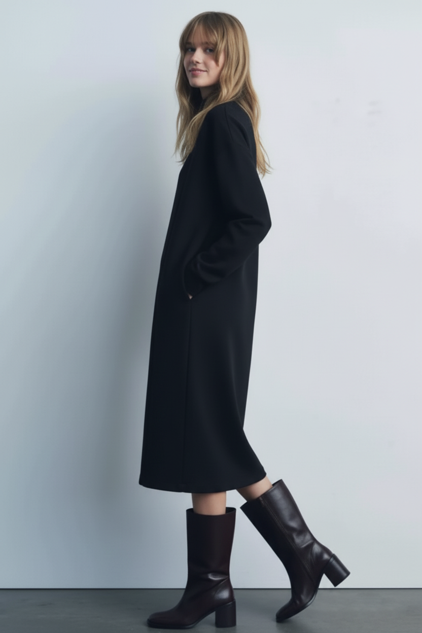 ينسدل الفستان بطوله المتوسط متعدد الاستخدامات بنعومة فائقة، ليبرز جمال قوامكِ بشكل مثالي في كل مناسبة. سواء كنتِ متوجهة إلى العمل، أو تستمتعين بلقاء صباحي في عطلة نهاية الأسبوع، أو تتألقين في أمسية خاصة، فإن هذا الفستان يتكيف مع جميع إطلالاتكِ. تصميمه النظيف وحرفيته المتقنة يجعلان منه قطعة استثمارية خالدة ستعتزين بها عاماً بعد عام.