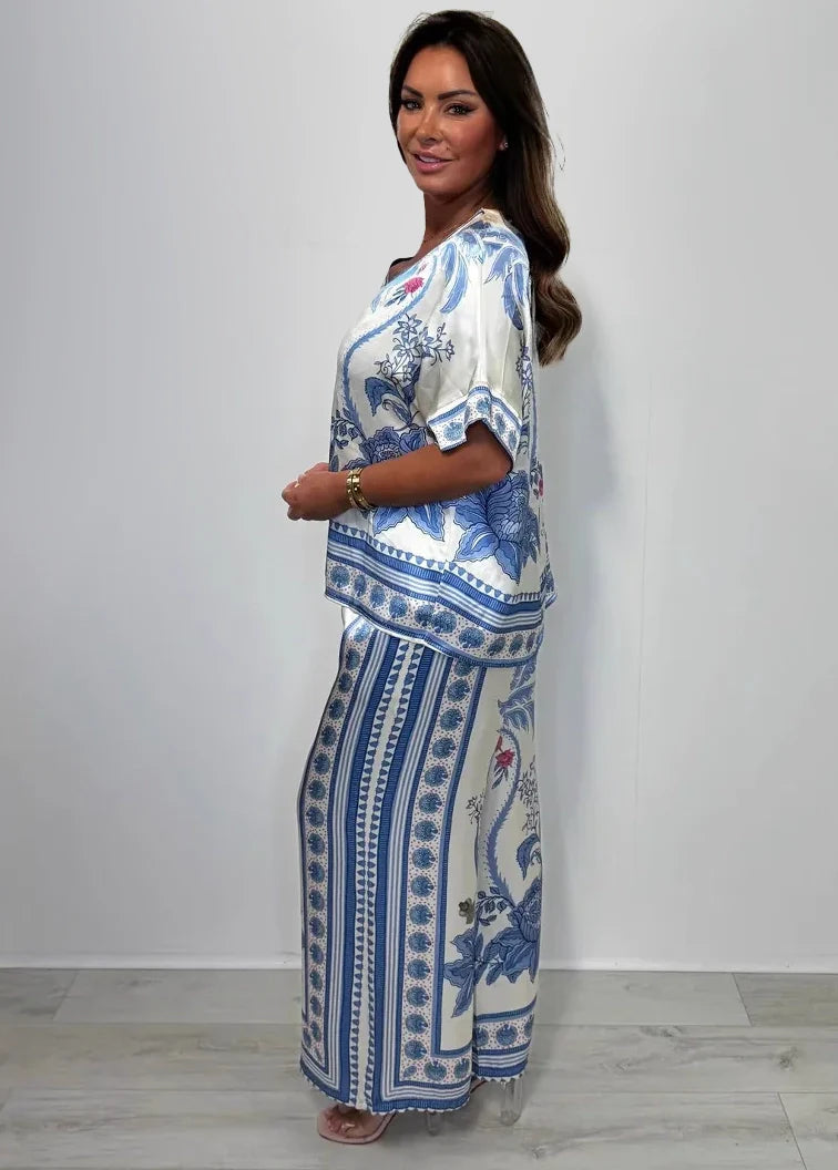 طقم بالازو من الساتان الفاخر بنقشة زرقاء ملكية