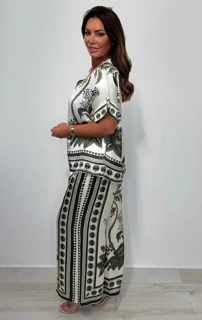 راحة حريرية فائقة: مزيجنا المميز من 97% ساتان و3% إيلاستين ينساب على بشرتكِ، ليمنحكِ مرونة لطيفة ولمسة ناعمة ومنعشة. ✨ قصة مريحة وجيدة التهوية: صُممت التصميمات الفضفاضة والخفيفة لكل من القميص والبنطال لتمنحكِ الراحة والحرية، أينما كنتِ. 🌸 أناقة سهلة: تُضفي الطبعة الجميلة لمسة راقية على هذه المجموعة المريحة. تألقي بإطلالة أنيقة على الفور، دون أي جهد. 🧵 جودة تشعرين بها: صُنعت بخبرة لطبقة نهائية متينة وعالية الجودة، تُشعركِ بالفخامة كما تبدو، غسلة بعد غسلة.