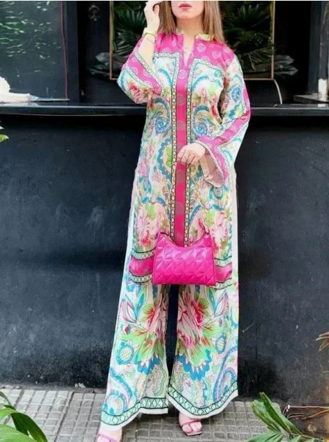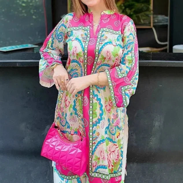 استمتعي بسحر الأناقة مع هذه المجموعة الرائعة بأكمامها الطويلة. تصميمها الانسيابي ونقوشها النابضة بالحياة تُجسّد التراث الفني المغربي الغني، مما يجعلها الخيار الأمثل لأيام الراحة والمناسبات الخاصة. مصنوعة من قماش خفيف الوزن، توفر هذه المجموعة راحةً وتهويةً استثنائيتين، مثاليةً لمناخ المغرب الدافئ. تصميمها الفريد وقصتها المريحة تضمن لكِ الشعور بالأناقة والراحة أينما ذهبتِ. تألقي بجمال الأسلوب المغربي مع هذه القطعة الآسرة.