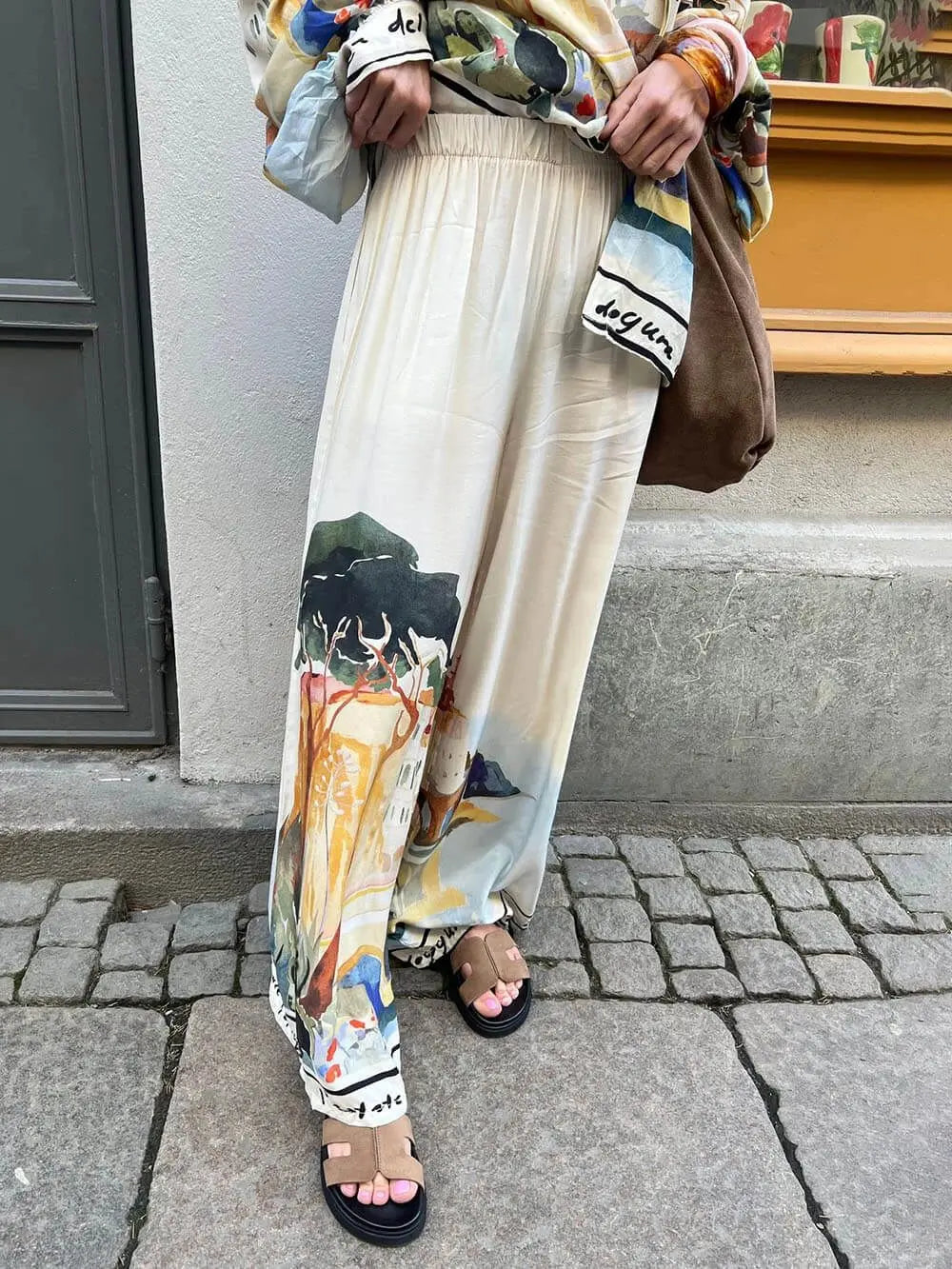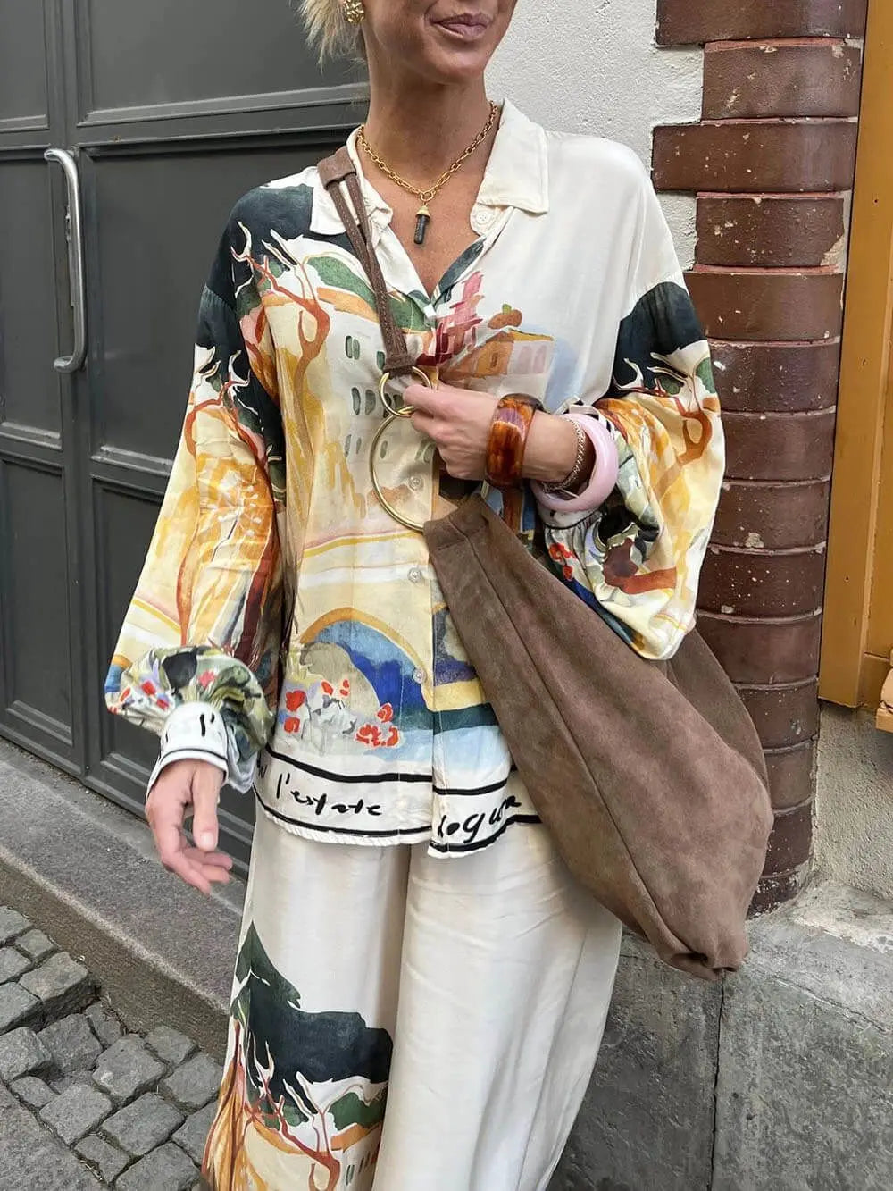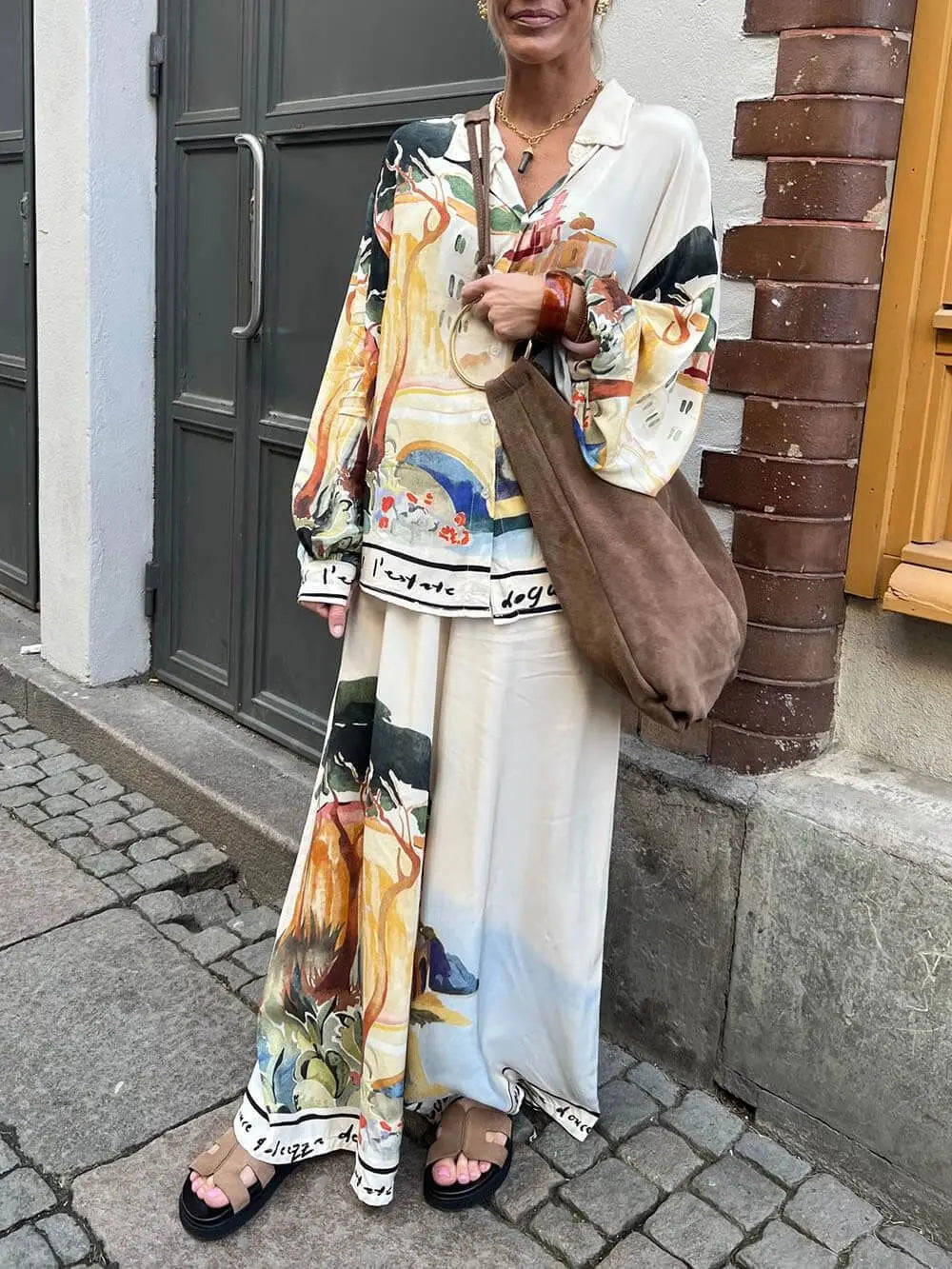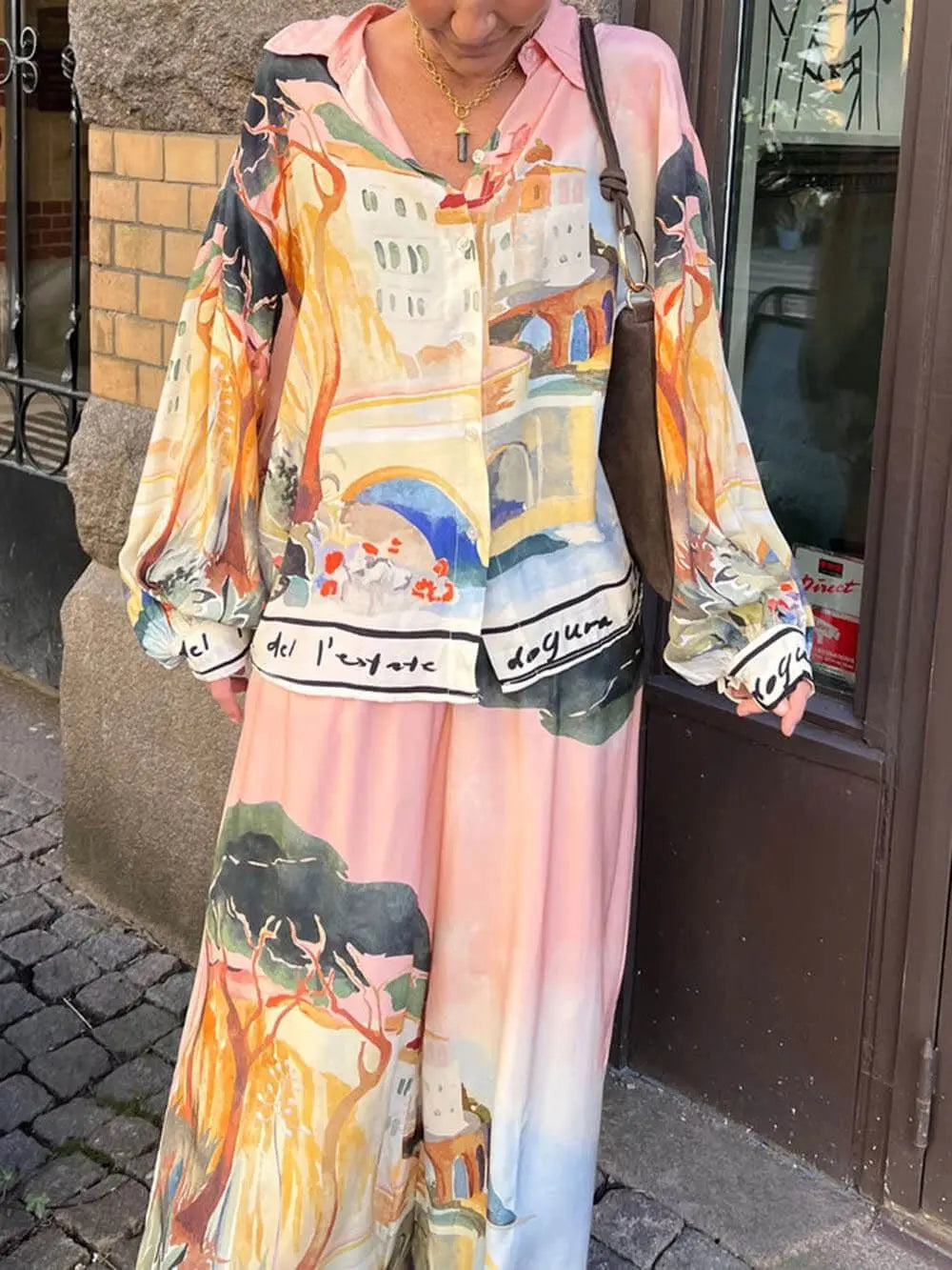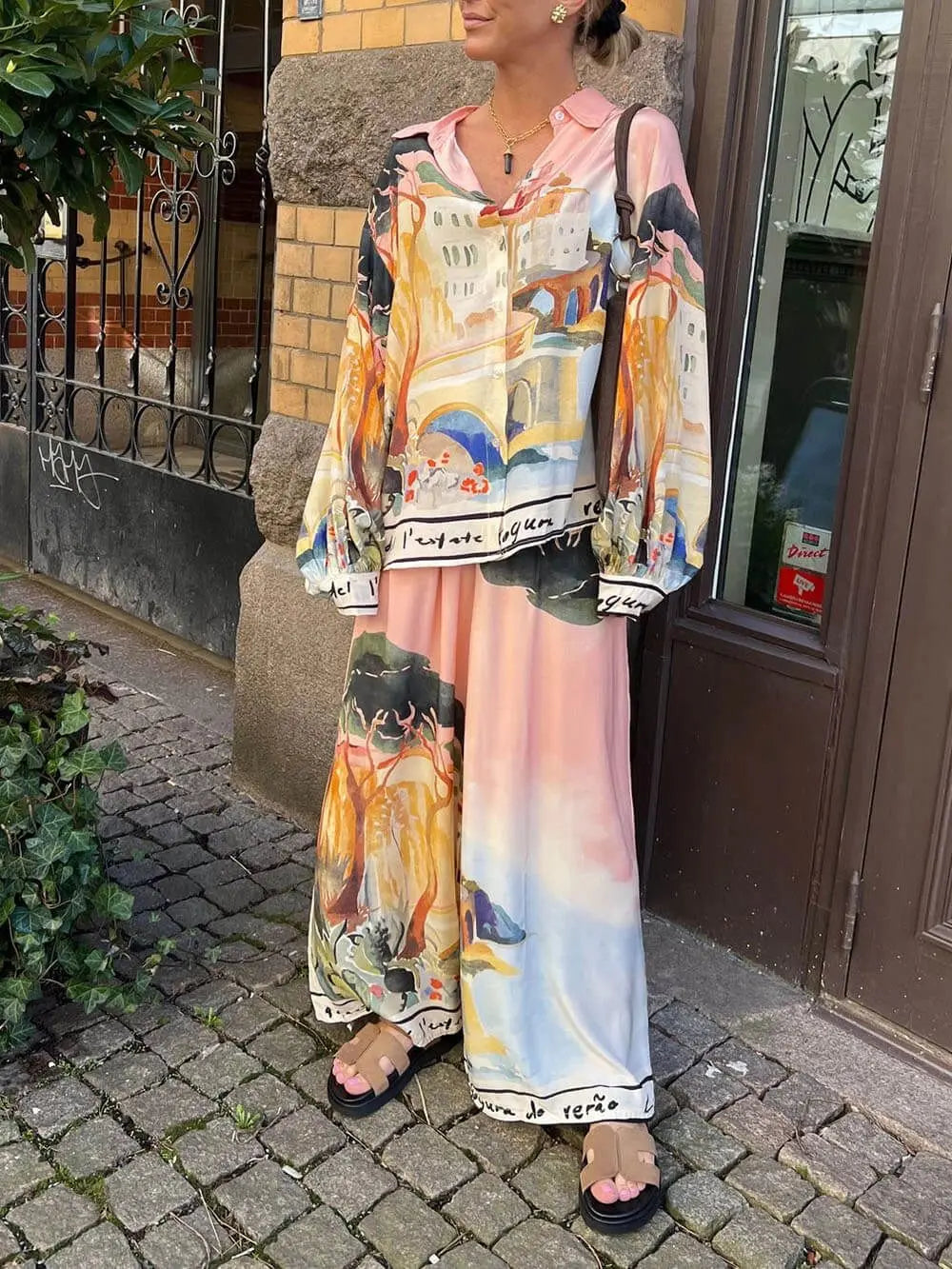 طقم ساتان فضفاض بتصميم لوحة فنية