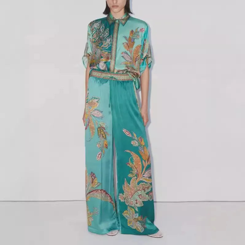 تم صنعه في الساتان الفيروزي المزخرف المزخرف بزخارف الكشمير المعقدة من الفروق الدقيقة الغنية باللون الأزرق المخضر والبني والبلاط الرقيق بلمسات الورد، هذه المجموعة توفر سيولة ولمسة فاخرة. Le chemisier à manches Courtes et col classique présente une cup décontractée pour un confort الأمثل. البنطلون القصري، مع ذيله المرن، يوفر صورة ظلية رقيقة تمامًا ويوفر حرية الحركة غير القانونية، ومثالي للتدفئة اليومية المغربية.