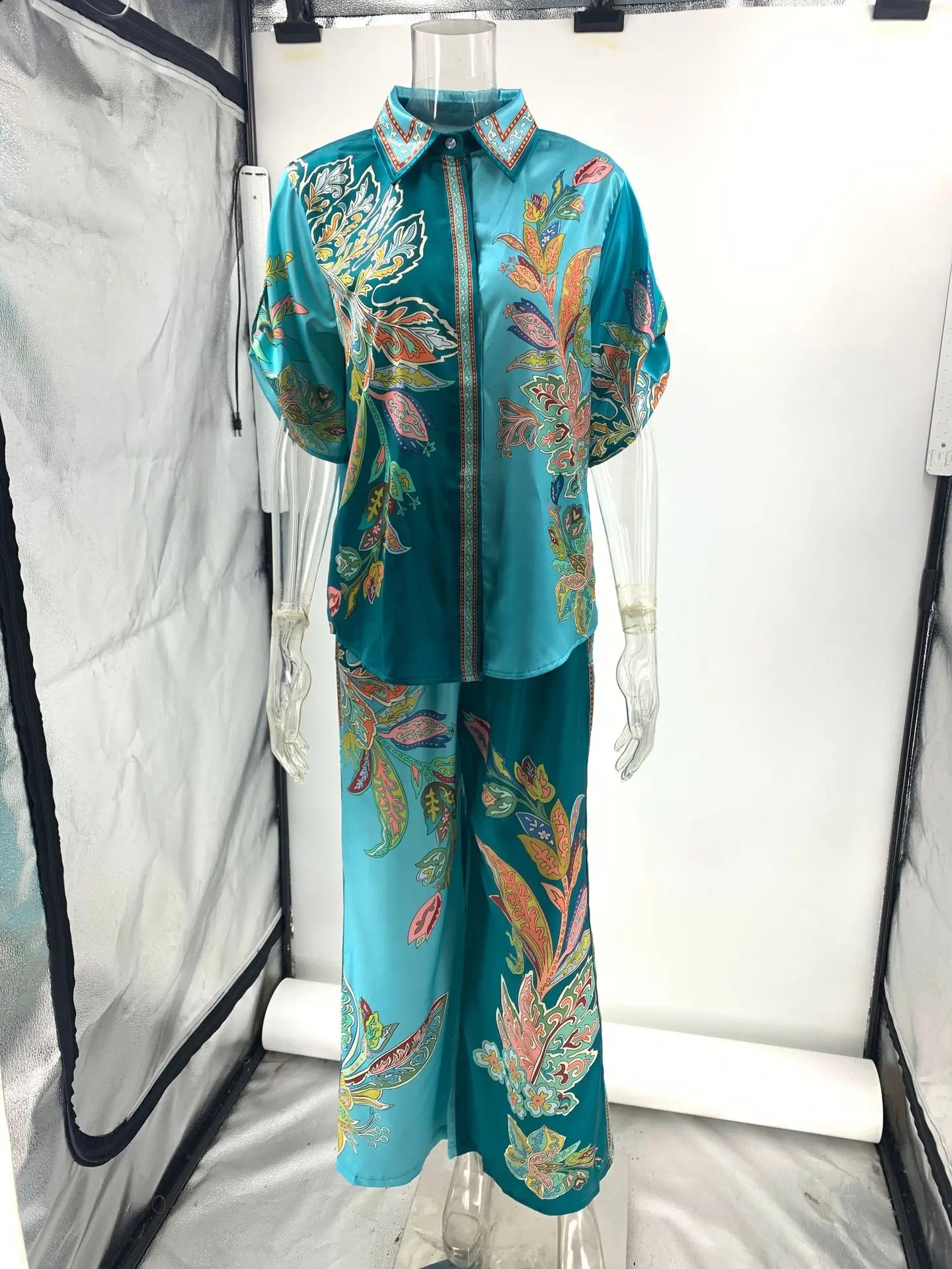 الجزء العلوي: قميص كلاسيكي ذو ياقة وأزرار وأكمام قصيرة أنيقة على شكل أجنحة خفاش